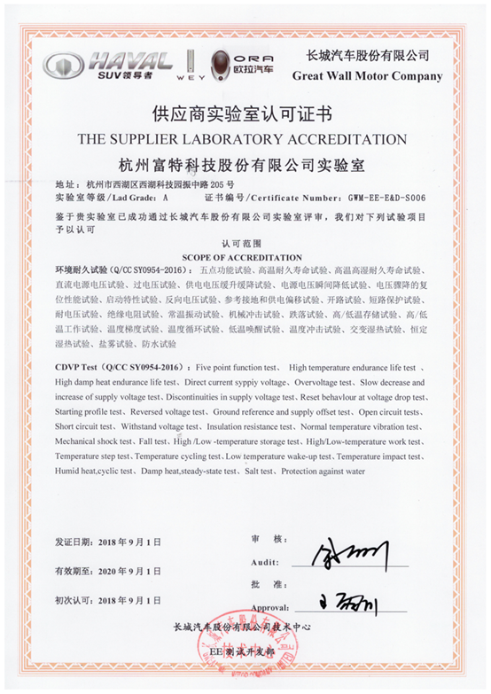 年9月,富特科技實驗室迎來好消息,正式成為了長城汽車授權認可的第二方實驗室,獲得其環境耐久試驗的授權。